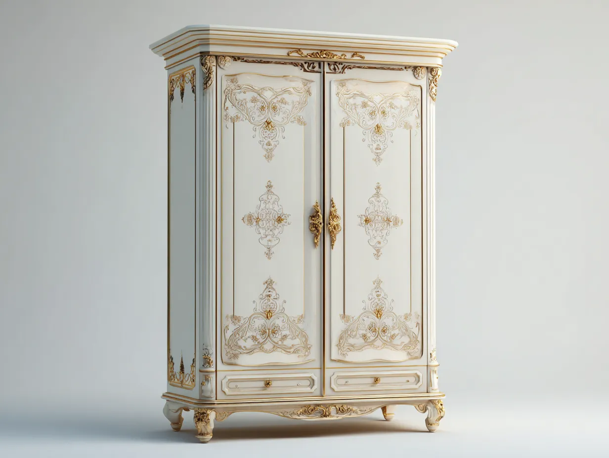 La estructura está fabricada en madera resistente con acabado en color blanco y detalles decorativos en tono dorado que resaltan el estilo ornamental del mueble. Las superficies presentan relieves decorativos y tiradores metálicos que complementan el diseño clásico y aportan carácter al conjunto.