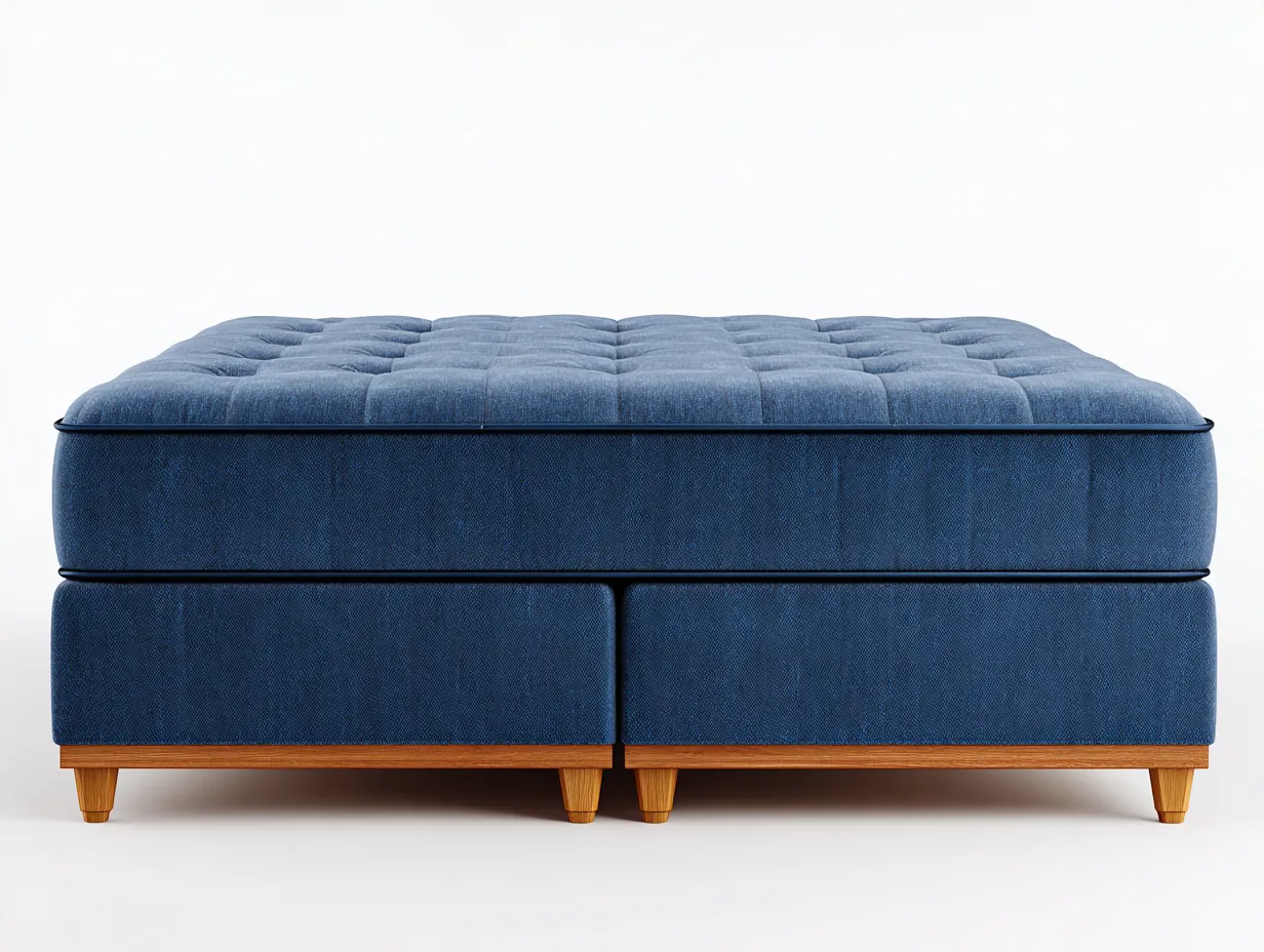 La cama está fabricada con estructura resistente y tapizado en tela de color azul con textura suave. La parte superior presenta un acabado capitoné que mejora la apariencia del conjunto y aporta una superficie acolchada cómoda. Las patas en acabado madera proporcionan estabilidad y un contraste natural con el tapizado.