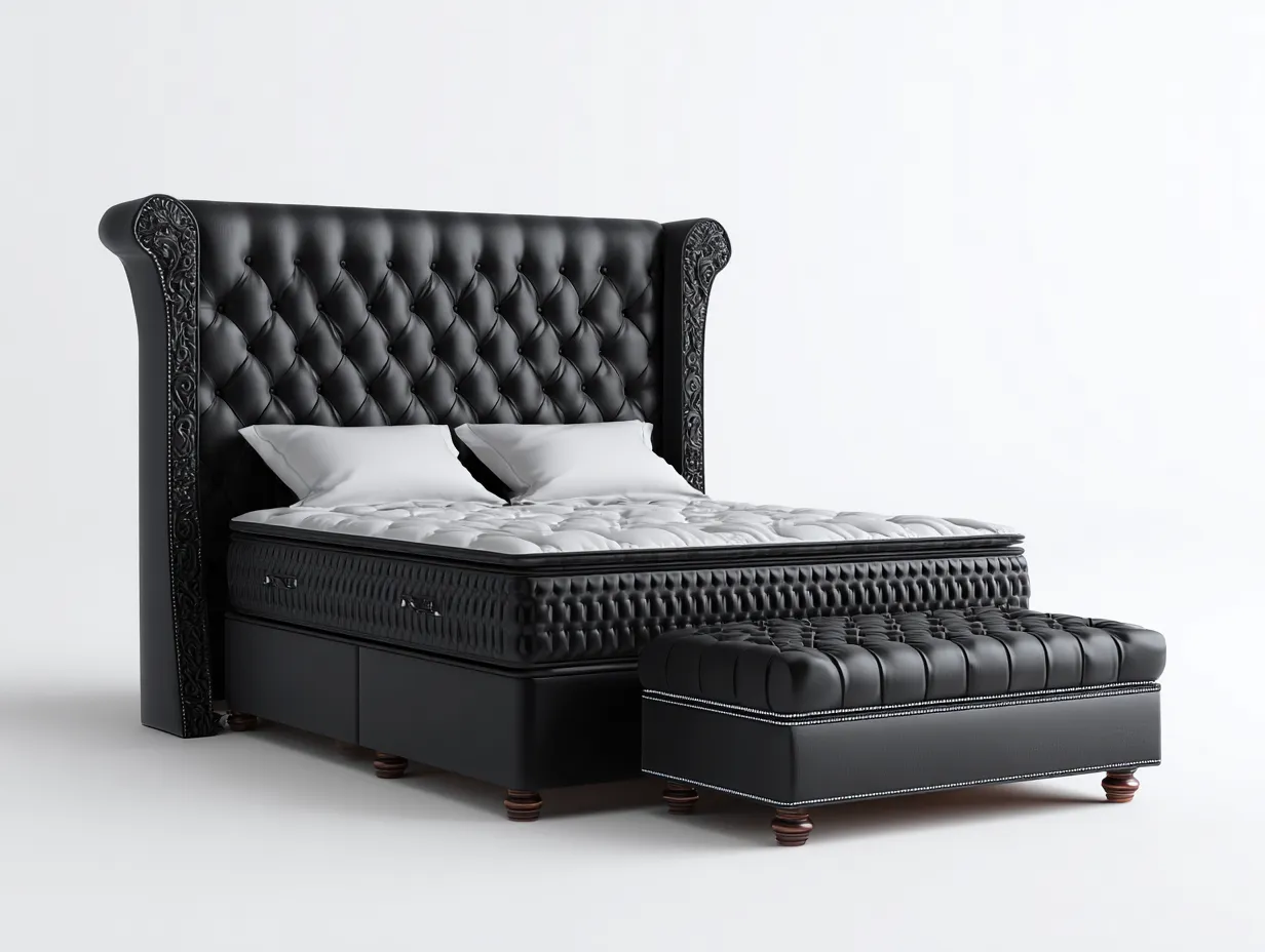 La estructura interna está fabricada en madera resistente que proporciona estabilidad y durabilidad. El exterior está tapizado en cuero sintético de color negro con acabado capitoné que aporta textura y carácter visual. Los detalles decorativos en los laterales del cabecero complementan el estilo clásico del conjunto.