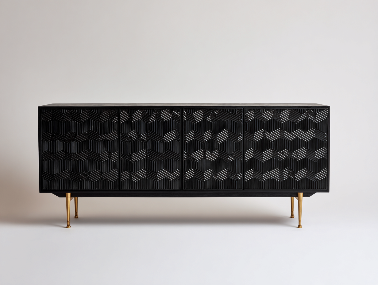 La estructura del mueble está fabricada con madera resistente que proporciona estabilidad durante el uso diario. La superficie presenta un acabado en color negro que resalta el relieve geométrico de las puertas. Las patas metálicas en tono dorado aportan contraste visual y elevan ligeramente el mueble para facilitar la limpieza del suelo.